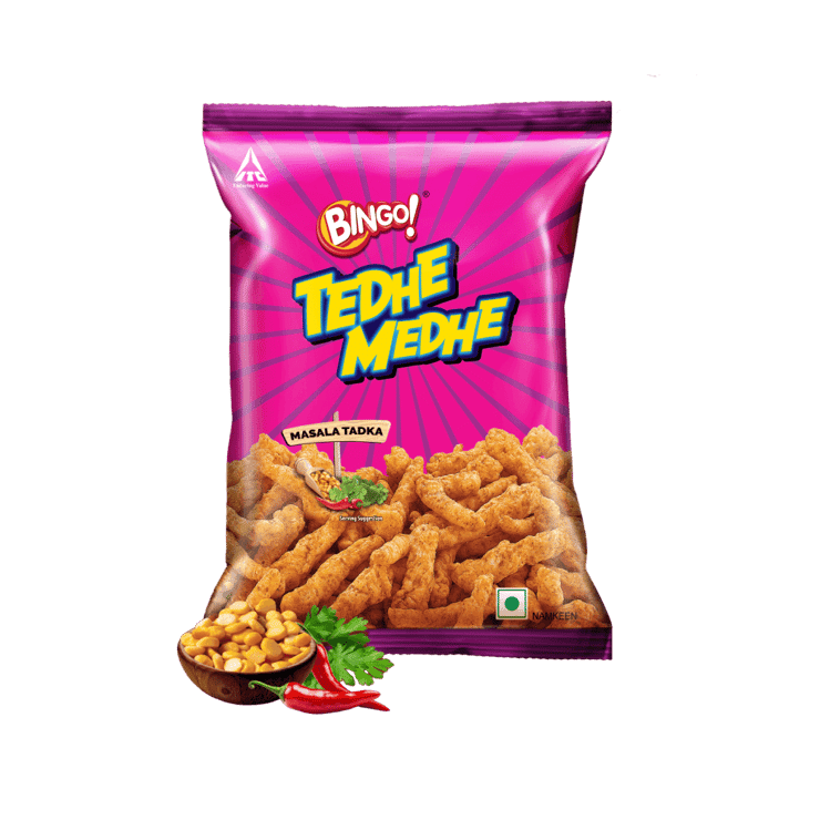 Experience a burst of flavor with every bite of Bingo Tedhe Medhe Masala Tadka Crisps, crafted for true snack lovers.