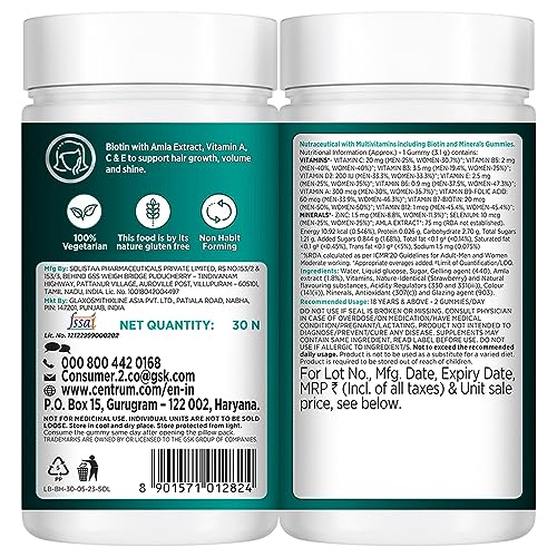 - DAILY REQUIRED BIOTIN : Two Gummies of Centrum Healthy Hair Biotin in tasty Gummy that can be consumed on the go.