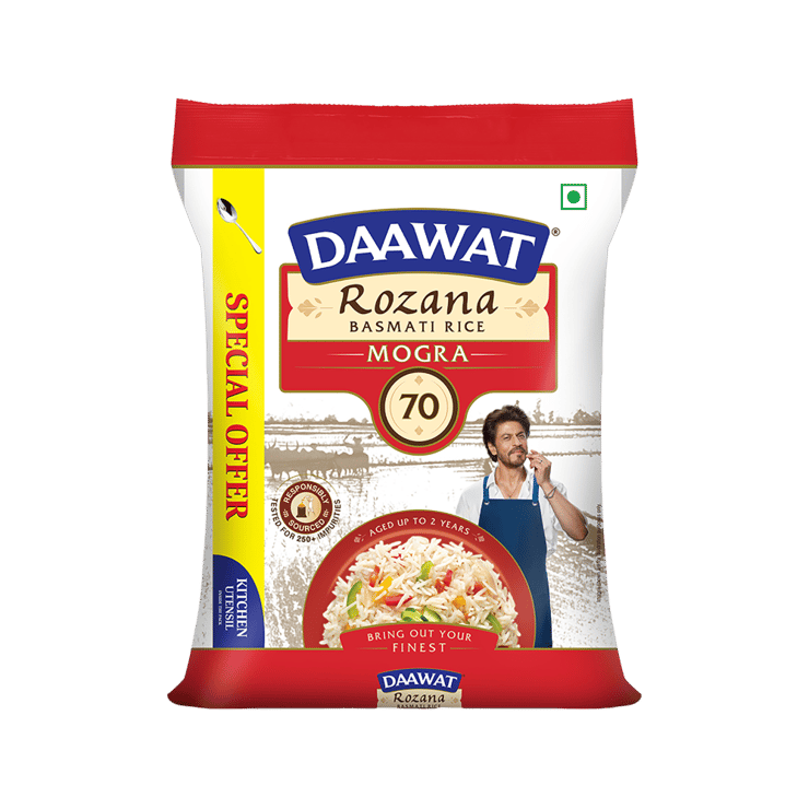 Daawat Rozana Mogra Basmati Rice features fragrant short basmati grains that cook evenly and absorb flavors well. The rice delivers tender texture with pleasant aroma, making it suitable for daily meals and traditional recipes with consistent results.