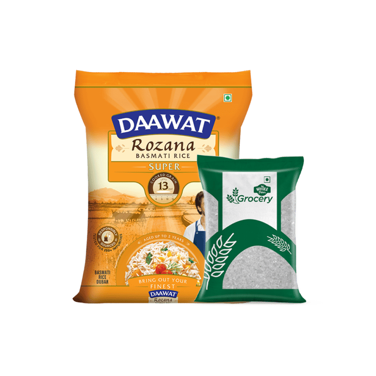 This combo pairs Daawat Rozana Super Basmati Rice with Whole Farm Grocery Sugar to support everyday cooking needs. The basmati rice delivers uniform medium grains, soft texture, and reliable cooking performance, while the sugar complements daily beverage and recipe use. Together, they offer convenience, consistent quality, and value for regular household consumption.