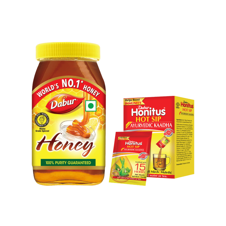 Dabur Honey – 100% Pure, World’s No.1 Honey Brand (No Sugar Adulteration) + Honitus Hot Sip Ayurvedic Kaadha Combo – 250 g + 7 x 4 g