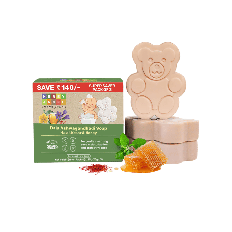 Herby Angel Organic Bala Ashwagandhadi Baby Soap is formulated using traditional Ayurvedic herbs known for their skin-soothing properties. It gently cleanses without stripping natural oils and helps maintain baby?s skin softness and comfort. Suitable for daily bathing, this mild soap supports healthy skin balance while offering nourishing care ideal for sensitive baby skin.