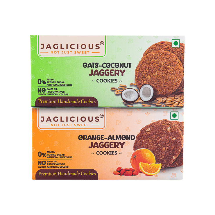 Jaglicious Jaggery Cookies Combo Pack features cookies sweetened with jaggery to deliver a traditional, earthy sweetness. The crunchy texture and natural flavour profile make them suitable for tea-time or mindful snacking. The assortment offers variety while focusing on heritage-inspired ingredients and balanced taste.