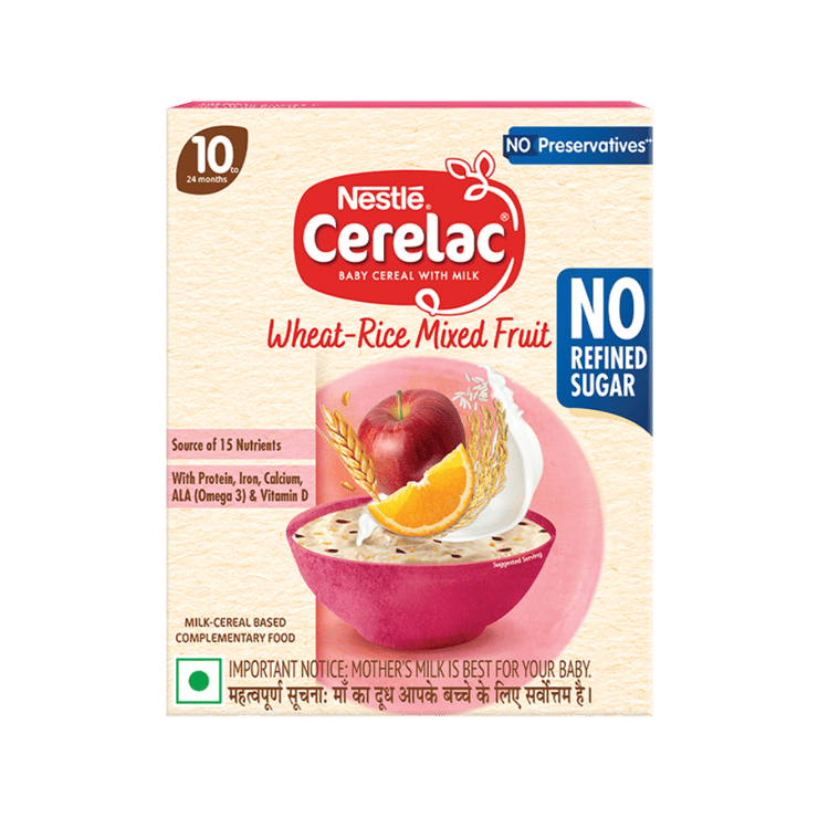 Nestle Cerelac Wheat Rice Mixed Fruit Baby Cereal is designed to support feeding from ten months onwards. The cereal offers mild fruit flavour and smooth consistency for easy spoon-feeding. With no refined sugar, it supports everyday baby feeding routines as part of a balanced diet.