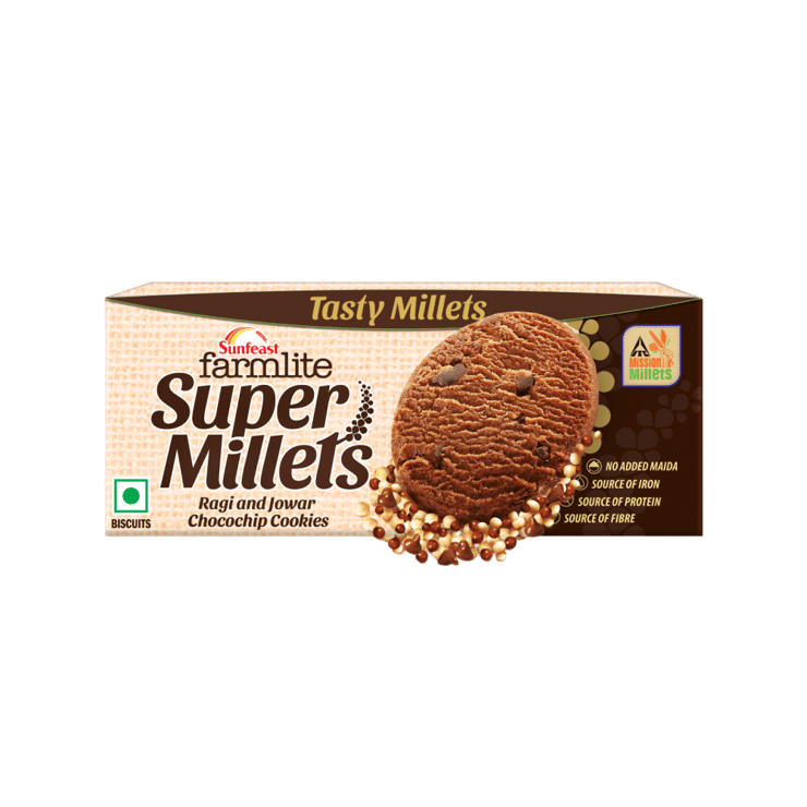 Sunfeast Farmlite Super Millets Ragi and Jowar Chocochip Cookies combine traditional millets with chocolate chips for a balanced snack. The crunchy texture and mild sweetness make them enjoyable for tea-time or casual munching. Designed for those seeking millet-based options with indulgent flavour.