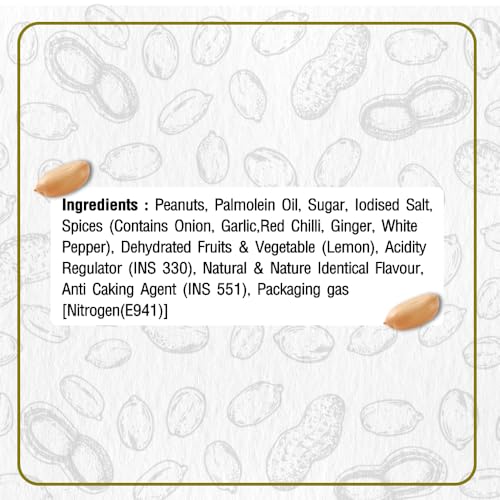 Lemon Spice Peanuts – Bold, Zesty, and Crunchy SnackIndulge in the irresistible crunch of our Lemon Spice Peanuts, a perfect balance of bold spices and tangy lemon. Each peanut is coated with a flavorful blend of garlic, chili, ginger, and a hint of white pepper, delivering a zesty punch that will keep you coming back for more.Key Features:Bold Flavor: Tangy lemon and spicy seasonings for a bold kick.Crunchy: Roasted to perfection for a satisfying crunch.Nutritious: High in protein, healthy fats, and essential vitamins.Convenient: Perfect for on-the-go snacking.Versatile: Enjoy as-is or add to meals for extra flavor.Perfect for those who crave a spicy, tangy, and crunchy treat, our Lemon Spice Peanuts are your new go-to snack. Whether you’re looking for a healthy snack option or something to spice up your meals, these peanuts have you covered. Try them today and taste the perfect blend of bold spices and zesty lemon!
