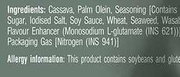 - Cassava, Palm Olein, Seasoning [Contains Sugar, Iodised Salt, Soy Sauce, Wheat, Seaweed, Wasabi, Flavour Enhanced