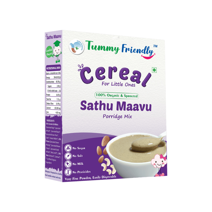 TummyFriendly Foods Organic & Sprouted Sathu Maavu is prepared using sprouted grains and pulses. The porridge mix cooks smoothly and delivers mild taste suitable for babies. Designed without refined additives, it supports traditional feeding practices and daily baby meals.